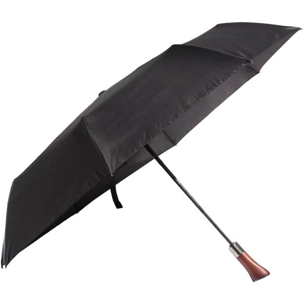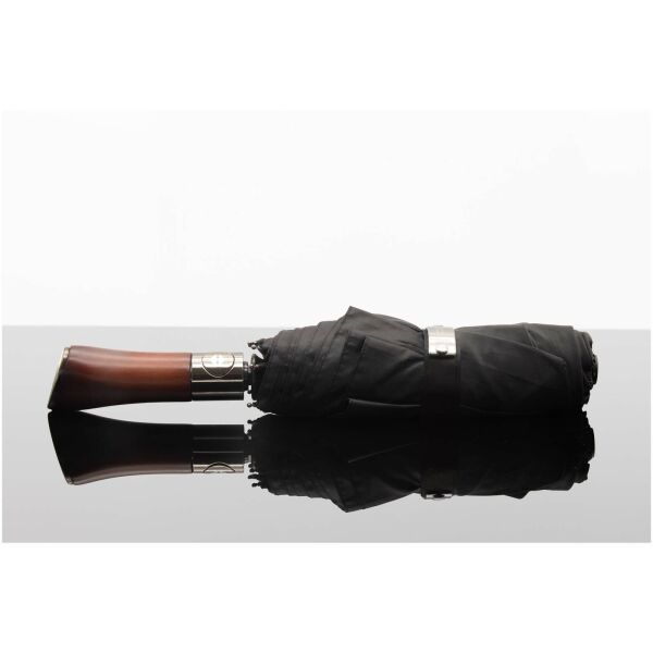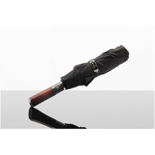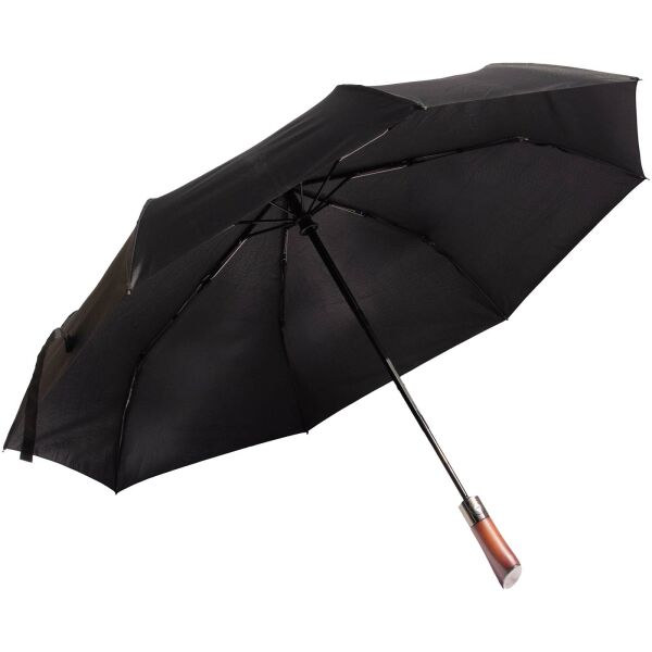 Opvouwbare automatisch open-/sluitparaplu die klassieke vakmanschap combineert met moderne duurzaamheid. Gemaakt van waterafstotend rPET 210T pongee-materiaal, voorzien van een robuuste houten stok en flexibele glasvezelspaken voor verbeterde windbestendigheid. De geïntegreerde drukknop maakt snel en moeiteloos openen en sluiten mogelijk. Wordt geleverd in een waterbestendige EVA-capsule en bevat een bijpassende paraplutas. Personalisatie mogelijk op de metalen plaat van de sluitknop. Wordt geleverd in een cilindrische geschenkverpakking van gerecycled papier.